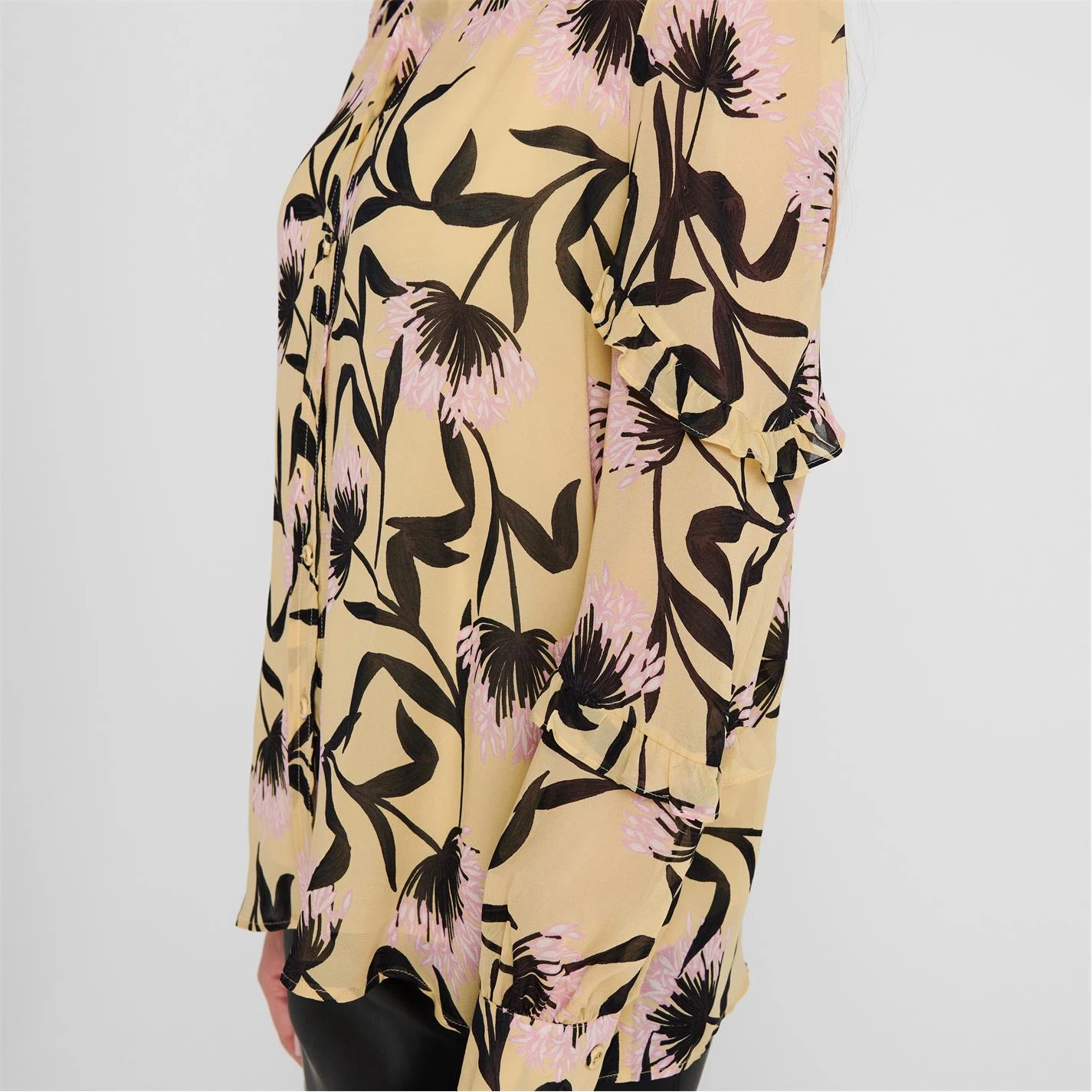 Made from a 100% Viscose fabrication, this blouse has been designed with an all-over floral print in a bold statement colourway. With an under slip top, this mesh blouse details a round neckline adorned with a full button fastening and long sleeves cuffed with button fastening, this look is complete with a classic silhouette detailed with a frill trim to the sleeve for a feminine touch, pair with trousers and flats for a casual look.